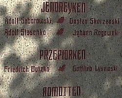 Gefallene 1914-18 ![]() Broziewski, Gustav, Lissewen Broziewski, Otto, Lissewen Budzinski, Anna, Borschimmen (Einzelgrabstein, Ziviltote) Butzko, Friedrich, Przepiorken Czybulka, Gustav, Lissewen Gritzo, Friedrich, Gronsken Kaminski, Franz, Romanowen Kuschma, Otto, Romotten Knies, Gottlieb, Stoosnen Knoch, August, Duttken Komossa, Hermann, Duttken Kowalewski, Johann, Gronsken Kowalewski, Jakob, Gronsken Lask, August, Romanowen Lask, Jakob, Romanowen Lojewski, Martin, Gronsken Lysewski, Gottlieb, Przepiorken Matteyka, Friedrich, Burnien Nowosadtko, Friedrich, Lissewen Prostka, Johann, Gronsken Palzewski, Adolf, Lissewen Rogowski, Friedrich, Gronsken Rogowski, Johann, Jendreyken Ryck, Gottlieb, Gronsken Saborowski, Adolf, Jendreyken Sawatzki, Adam, Gronsken Semborski, Fritz, Lissewen Schendowius, Fritz, Lissewen Silla, Wilhelm, Stoosnen Skorzenski, Ludwig, Lissewen Skorzenski, Gustav, Jendreyken Staschko, Adolf, Jendreyken Tiborski, Jakob, Duttken Wlockno, August, Romotten ![]() Bildnachweise: (1) Manfred Podzkiewitz |