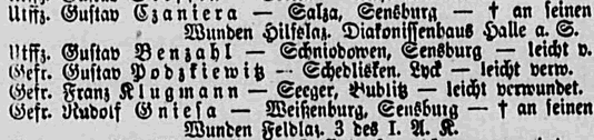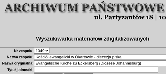 - Gefallene des 1. WK im Kirchspiel Borszymmen/Borschimmen - Gefallene des 1. WK im Kirchspiel Baitkowen/Baitenberg Freie Archive ![]() Nachfolgend eine Auflistung von Archiven zur Ahnen- und Familienforschung in Ostpreußen, die kostenlos zugänglich sind. Einige weisen eine Suchfunktion nach Orts- und Familiennamen auf, wieder andere stellen nur Kirchenbücher, Standesamtsbücher oder sonstige Unterlagen zur Verfügung. Suchen muß man selbst. Das Staatsarchiv Allenstein ![]() Einen der umfangreichsten Bestände ostpreußischer Kirchenbücher und Standesamtsunterlagen finden wir im Archiwum Państwowe w Olsztynie, dem Staatsarchiv in Allenstein/Olsztyn. Viele davon wurden bereits der Öffentlichkeit zugänglich gemacht und können direkt ohne Anmeldung eingesehen werden. Zudem wurden viele der Bestände des Archives vom Allensteiner Indexierungsprojekt erfasst und in eine Datenbank eingetragen, die bequem nach Namen und Orten sortiert durchsucht werden kann. Zur Suchmaske des Staatsarchives Allenstein Zum Namensindex des Allensteiner Indexierungsprojekts ![]() Die Suchmaske des Staatsarchivs Allenstein (1). Im Abschnitt "Nazwa oryginalna" findet man die deutschen Namen der Orte, Kirchspiele und Dokumente. Polnische genealogische Gesellschaft ![]() Auch die polnische genealogische Gesellschaft führt eine umfangreiche kostenfrei durchsuchbare Datenbank mit zahlreichen Kirchenbüchern und diversen Standesamtsunterlagen aus vielen Regionen, die früher oder heute zum polnischen Staat gehörten. Darunter befinden sich auch zahlreiche Daten aus Ortschaften in Ostpreußen. Wähle hier die Region "Warminsko-Mazurski" an, um zu den Unterlagen aus Ostpreußen zu gelangen. Zur Datenbank: https://geneteka.genealodzy.pl Ortsfamilienbuch Memelland ![]() Ein umfangreiche Datenbank mit 170.000 Familien und über 500.000 Personen ist das sog. Ortsfamilienbuch Memelland. Es umfasst die nördlich des Memel-Flusses gelegenen Kreise Memel, Heydekrug und Pogegen, welche heute zu Litauen gehören. Zum Ortsfamilienbuch: https://www.online-ofb.de/ Geheimes Staatsarchiv Preußischer Kulturbesitz ![]() Als Verwahrstelle für Kirchenbücher ist das Geheime Staatsarchiv Preußischer Kulturbesitz eher nicht bekannt, und trotzdem finden sich dort Bücher, die man anderswo vergeblich sucht. So kann man dort zugangsfrei folgende Kirchenbücher aus den Jahren 1800 bis 1874 als Digitalisate einsehen: Aus der Stadt und dem Landkreis Königsberg in Preußen sowie aus den Kirchspielen des Landkreises Fischhausen. Zur Übersicht der Kirchenbücher im Staatsarchiv Die Martin-Opitz-Bibliothek ![]() ist die Hauptverwahrstätte für Literatur aus den ehemaligen deutschen Ostgebieten und weiteren Orten der deutschen Ostsiedlung. Neben Aufzeichnungen von Schlesien bis hinauf in die heute estnische Hansestadt Narwa, finden sich dort auch die sog. Hipplerschen Kirchenbücher aus dem ostpreußischen Ermland, die Abschriften originaler Kirchenbücher, sprich Heiraten, Taufen und Sterbefälle für verschiedene Gemeinden über den Zeitraum vom 16. bis zum 19. Jahrhundert beinhalten. Weiterhin finden sich dort Adreßbücher verschiedener Städte aus dem 19. und 20. Jahrhundert, so u.a. aus Königsberg, Elbing, Allenstein, Insterburg, Braunsberg und Lyck. Zur Übersicht der ermländischen Kirchenbücher Zur Übersicht der Adreßbücher Verein für Computergenealogie ![]() ![]() Suchergebnis aus den Verlustlisten des 1. WK (2) Der Verein bietet eine übergreifende Orts- und Personensuche aus mehreren Datenbanken an, so z.B. aus den Verlustlisten des 1. Weltkrieges (hier: verwundete und verstorbene Soldaten), aus Ortsfamilienbüchern, Adreßbüchern, Grabsteinen und dem oben genannten Allensteiner Indexierungsprojekt. Zur Metasuche https://meta.genealogy.net/search Arbeitsgemeinschaft ostdeutscher Familienforscher ![]() Auch auf den Seiten der Arbeitsgemeinschaft ostdeutscher Familienforscher e.V. findet sich eine Metasuche die viele Quellen abdeckt, so die Datenbanken der Masurenforschung, aber auch die Familienanzeigen im Ostpreußenblatt oder den Schriften der einzelnen Kreisgemeinschaften. Um die Ergebnisse ansehen zu können ist eine Anmeldung notwendig, diese ist aber kostenfrei. Weitere Recherchemöglichkeiten ![]() Hier wären zu nennen die Arolsen-Archives, falls einer deiner Vorfahren im oder direkt nach dem 2. Weltkrieg Zwangsarbeiter, Verschleppter oder Verfolgter war. Wenn er Soldat des 1. oder 2. Weltkrieges war und im Felde gefallen ist, dann findest du ihn höchstwahrscheinlich bei der Gräbersuche des Volksbundes (ehemals Volksbund Kriegsgräberfürsorge) wieder. ![]() Bildnachweise: (1) Staatsarchiv Allenstein (Lizenz: Gemeinfrei) (2) Verlustliste (Quelle: https://genealogy.net) |