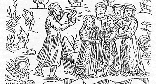 ![]() Wer lebte eigentlich in dem Gebiet, welches uns später als Ostpreußen bekannt wurde, noch bevor sich ab dem 13. Jahrhundert im Zuge der deutschen Ostkolonisation deutschsprachige Siedler dort niederliessen? ![]() Die altpreußischen Landschaften (1) Es waren baltische Stämme, die in 11 bekannten Stammesfürstentümern lebten. Sie waren die Urbevölkerung Ostpreußens, bevor mit dem Deutschen Orden das Land in die niedergeschriebene Geschichte eintauchte. Sie begegnen uns in alter Literatur als "Brus", "Prusai", "Pruzzen" oder "Preuszen". Nur wenige schriftliche Zeugnisse liegen von ihrer Lebensart und Kultur vor. Trotzdem ist der Wissenschaft ihre Kultur-, Lebens- und Glaubenswelt nicht gänzlich unbekannt. Das Siedlungsgebiet jener Stämme, die gemeinhin Prußen oder Preußen genannt wurden, umfasste in etwa das spätere Ostpreußen und einige Gebiete darüber hinaus. Zur besseren Abgrenzung zum späteren Staat Preußen werden diese Stämme gemeinhin Altpreußen genannt. Ab wann die Altpreußen dieses Gebiet besiedelten ist unbekannt, doch lassen archäologische Funde auf eine sehr lange Besiedlungskultur schließen. Die Altpreußen verehrten wie viele nichtchristliche alteuropäische Völker die Natur. So waren, wie bei den alten Germanen, Thingplätze meist unter heiligen Bäumen und Hainen zu finden. In ihrer Naturreligion galt die ganze Natur als belebt und beseelt. Eichen, Ulmen und Eschen wurden häufig als Schutzbäume von Familien oder Siedlungen angesehen. Das Abschälen von Baumrinde am lebenden Baum galt daher als Frevel. Neben dieser Naturverehrung gab es auch personifizierte Götter, wie der bärtige Perkunos, ein Donnergott - dem germanischen Thor vergleichbar. Daneben findet sich Potrimpos, der ewige Jüngling, Gott alles Schönen und der Fruchtbarkeit, Pikallos - der als hagerer Greis mit grauem Bart dargestellt wurde, so wie Allvater Odin bei den Germanen. Überhaupt ergeben sich viele Paralellen zu den germanischen Gottheiten und dem germanischen Glauben. Durch den Kontakt zu Germanenvölkern während der Zeit der Völkerwanderung könnten religiöse Einflüsse übernommen worden sein, doch da keine Schriftzeugnisse aus dieser Zeit vorliegen, ist dies nicht gesichert. Es ist jedoch bekannt, dass sich u.a. die Goten längere Zeit an der unteren Weichsel aufgehalten haben und mit den Altpreußen zusammenlebten. Gotische Gräber aus gleicher Zeit finden sich daher selbst noch im Masurenland, direkt neben altpreußischen Begräbnisstätten. ![]() Preußische Hochzeit (2) Von Reisenden der Vor-Ordenszeit wurden als Haupttugenden der Altpreußen die Gastfreundschaft, eine tiefe Religiosität sowie eine große Freiheits- und Friedensliebe berichtet. Während die weltlichen Fürsten die Herrschaft über das Land ausübten, wurde die Religion von Priestern und auch Priesterinnen vertreten. Den Hohepriester nannte man Kriwe, er hatte bei den baltischen Völkern in etwa die Stellung des Papstes, sein Amtssitz war Romowe (Romehmen), dort stand das oberste Heiligtum der Preußen. Die lokalen Priester nannte man Weidelotten. Frühe Überlieferungen nannten die Bewohner der Region Aestii (Tacitus) oder Äster (Cassidior und Jordanes), die "friedliche Bauern waren, die vom Fischfang und vom Einsammeln des Bernsteins lebten." Tacitus beschrieb Sie in seiner "Germanica" so: „Weiter nun werden an der rechten Küste des Suevenmeeres (mare Suebicum) der Aestier Völkerschaften bespült, deren Gebräuche und ganzes Aeußere wie der Sueven sind, die Sprache näher der britannischen." Tacitus hielt sie vermutlich sogar für Germanen, als er niederschrieb, "Getreide und die andern Feldfrüchte bauen sie mit einer für die gewohnte Trägheit der Germanen großen Geduld." ![]() Preußische Frauen in landestypischer Tracht (3) Eroberung und Christianisierung Preußens ![]() Nach einigen gescheiterten Versuchen masowischer Herzöge im Land der Preußen Fuß zu fassen, versuchte man anfangs des 13. Jahrhunderts mit Hilfe des Deutschen Ordens die Stammesgebiete der Altpreußen zu erobern und zu missionieren. Die Eroberung des Preußenlandes begann um 1231 mit Landmeister Hermann von Balk, der mit ganzen 7 Ordensrittern und 700 Mann Fußvolk die Weichsel überquerte und noch im gleichen Jahr eine Burg auf dem Gebiet der heutigen Stadt Thorn erbauen ließ. Weitere Vormärsche ins Preußenland folgten. Dagegen gab es von preußischer Seite allerdings erhebliche Widerstände. So gab es mehrere Preußenaufstände, die bekanntesten unter Erkus Mants (Herkus Monte) einem Natanger Fürsten im Jahre 1260, der nach seiner Niederlage in Braunsberg und Brandenburg und seines nachfolgenden Rückzugs eher zufällig im Wald entdeckt und etwa um 1272 vom Komtur zu Christburg getötet wurde. Einen weiteren Aufstand gab es um 1277 unter Herzog Skomand, einem sudauischen Fürsten, der den Orden zeitweise in arge Bedrängnis brachte. Die Preußen rückten dabei bis an die Weichsel vor. Allerdings waren die Preußen den kampferprobten und gut organisierten Rittern des Ordens auf längere Frist militärisch unterlegen. Das Ende des altpreußischen Stammeswesens vollzog sich allerdings am Stammsitz des Sudauerfürsten Skomand, in der Nähe des gleichnamigen Sees bei Lyck. 1281 eroberten die Ordensritter Skomands hölzerne Wallburg, wobei der Anreiz nicht nur darin bestand, Skomands Widerstand zu brechen, da dieser die Jahre zuvor immer wieder Angriffe tief in die Ländereien des Ordens durchführte, man vermutete auch einen großen Silberschatz bei ihm. Skomand muß wohl auch sehr wohlhabend gewesen sein, die Herkunft des Namens soll sich von Skomantis ableiten, was einen reich gedeckten Tisch und somit ein wohlhabendes Haus bedeutet. Den Silberschatz fanden die Ritter damals nicht, erst Archäologen des 20. Jahrhunderts stießen bei Ausgrabungen auf reiche Silberfunde. Skomand ließ sich und seine Getreuen taufen und erhielt das Gut Steinen, wo er sich der Landwirtschaft widmete. Er starb um 1285 mit 60 Jahren