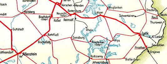 ![]() und die Lycker Kleinbahn Im Jahre 1868 kam die Eisenbahn nach Lyck (dem heutigen Elk), nachdem der Abschnitt von Rastenburg nach Lyck, als Teilstück der Ostpreußischen Südbahn, fertiggestellt war. Eine Verlängerung nach Prostken zur damaligen Reichsgrenze erfolgte nur drei Jahre später. Im damals russischen Polen wurde der Anschluß bis Bialystok und weiter nach Brest gebaut. Die Stadt Lyck war nun an den internationalen Eisenbahnfernverkehr angeschlossen. Weitere Bahnlinien folgten. ![]() Streckenverzeichnis 1930 (1) Eine Linie von Insterburg über Marggrabowa/Treuburg, hier war Eröffnung 1879, die Bahn von Johannisburg über Bialla, welche am 16. November 1885 bis Lyck in Betrieb ging, sowie die Bahnstrecke nach Rothfließ über Arys und Sensburg. Lyck wurde damit zu einem bedeutenden Eisenbahnknotenpunkt. Hinzu kam dann noch die meterspurige Schienenstrecke der Lycker Kleinbahn Aktiengesellschaft, mit der wir uns nachfolgend noch etwas näher beschäftigen werden.