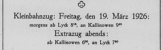 Die Streckenabschnitte Lyck -> Klein-Lasken -> Sawadden und Klein-Lasken -> Borschimmen wurden 1913 in Betrieb genommen. Die damalige Spurbreite betrug 1000 Milimeter. Der Weiterbau zu den Endpunkten Sawadden und Turowen verzögerte sich durch den Ersten Weltkrieg und die Besetzung des Kreisgebietes im Jahre 1914 durch die Truppen des russischen Zaren. Nachdem im Zuge der sog. Winterschlacht um Masuren das Gebiet zurückerobert wurde und die Kriegsschäden beseitigt waren, konnte am 5. Oktober 1918 dann endlich die Gesamtstrecke bis Turowen in Betrieb genommen werden. Beide Endpunkte lagen nur knapp von der damaligen deutsch-polnischen Grenze entfernt. Die Gesamtstrecke Lyck -> Turowen (Auersberg) beträgt 37,8 km, der Abzweig Klein-Lasken -> Sawadden (Grenzwacht) 9,7 km. Neben dem Personenverkehr, wurde die Bahn auch für den Güterverkehr genutzt. ![]() Werbeaushang zu einem Sonderzug der Kleinbahn (6) Bei Betriebsstart hatte die Bahn 4 Dampf-Lokomotiven der Achsfolge 1B aus der Lokomotivfabrik Arnold Jung in Kirchen (Sieg), 8 Personenwagen, 2 Post- und Gepäckwagen sowie 36 Güterwagen in ihrem Bestand. Verluste aus dem Weltkrieg wurden mit Loks der Achsfolge 1C ausgeglichen. Die letzte Lok wurde am 3.2.1920 geliefert, hatte 150 PS und wog 18,7 Tonnen. Mit kaum veränderten zahlenmäßigen Bestand, nun waren es 5 Loks, wurde der Betrieb bis Ende 1944 durchgeführt. Durch die Inbesitznahme dieses Teils Ostpreußens durch Polen im Jahre 1945, wechselte auch die Bahn den Besitzer. Sie wurde wurde den polnischen Staatsbahnen zugeschlagen. Durch den Wegfall der Grenze begann man 1948 mit Überlegungen die Bahn weiter nach Augustow zu führen. Ein Vorhaben, dass jedoch nie über das Projektstadium hinauskam. 1950-1952 wurde die Strecke auf 750 mm umgespurt. Den Betrieb stellten Lokomotiven der PKP-Baureihe Px48 sicher, die später von Lyd1-Dieselloks abgelöst wurden. In den 1990er Jahren erhielt die Bahn für den Personenverkehr in Rumänien entwickelte Triebwagen der Baureihe MBxd2. Auf der Lycker Kleinbahn ist der reguläre Personenverkehr seit Juni 2001 eingestellt, nachdem zuletzt nur noch ein Zugpaar zwischen Lyck und Grenzwacht (Zawady-Tworky) verkehrte, bzw ein Zugpaar von Lyck nach Dreimühlen (Kallinowo). Der Abschnitt Dreimühlen - Auersberg war bereits seit 1998 wegen einer maroden Brücke gesperrt. Die komplette Stillegung der seit 1992 unter Denkmalschutz stehenden Bahn war von der Staatsbahn PKP für September 2002 vorgesehen. Eine Abschiedsfahrt fand am 17. September 2002 statt. Die Stadt Elk (hier das Kultur- und Sportzentrum MOSIR) betreibt die Bahn seitdem als Touristikbahn weiter. Befahren werden die Streckenäste vom Lycker Kleinbahnhof (Elk Wask.) bis Sypittken (Sypitki) und Grenzwacht (Zawady-Tworky). Am Kleinbahnhof bietet ein kleines Museum einen interessanten Einblick in die Geschichte der Bahn. Das heute alles so wunderbar erhalten ist, verdankt man dem Engagement der Gebrüder Sawczynski und deren langjährige Arbeit. ![]() Bildnachweise: (1) Deutsche Reichsbahn (Lizenz: gemeinfrei) (2) (3) (4) (5) Manfred Podzkiewitz (6) Staatsarchiv Allenstein (Lizenz: gemeinfrei) |