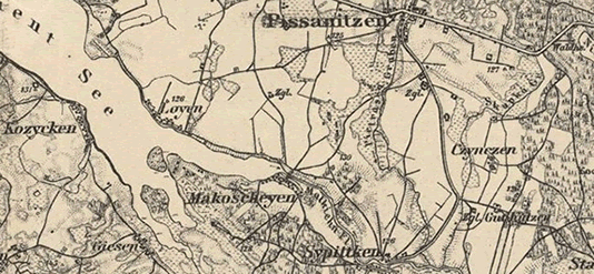 In Makoscheyen gab es einst das Gasthaus Feuersenger, welches in den 1930er Jahren von Paul und Martha Feuersenger betrieben wurde. Sie hatten zudem eine Landwirtschaft. Nach dem 1. Weltkrieg enstand ein Ehrenfriedhof (Soldatenfriedhof), der noch heute existiert. Makoscheyen war auch Geburts- und Wohnort mehrerer Podzkiewitz, die dort als Ziegler in den umliegenden Ziegeleien tätig waren (siehe hierzu auch: Die Ziegeleien im Kreis Lyck). ![]() Ziegelei Makoscheyen, Arbeitszeugnis meines Großvaters (2) ![]() Bildnachweise: (1) Staatsarchiv Przemysl (Lizenz: gemeinfrei) (2) Manfred Podzkiewitz |